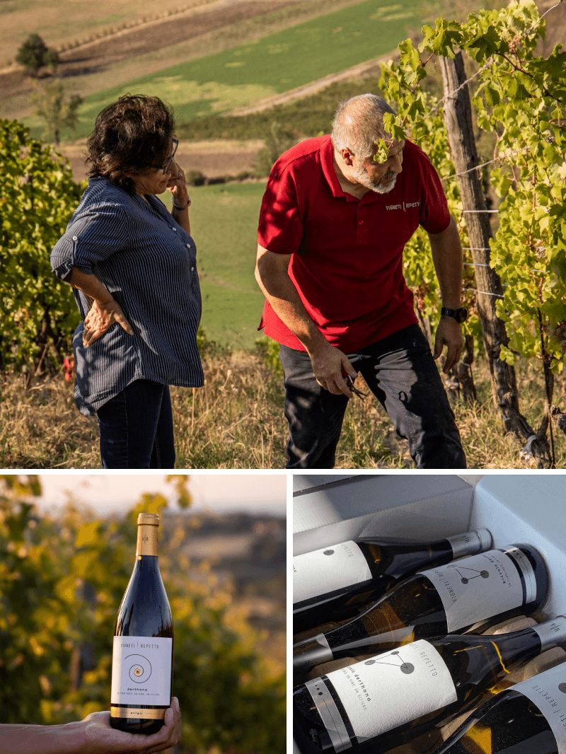 비네티 레페토(Vigneti Repetto)는 설립 11년 차로, 콜리 토르토네지(Colli Tortonesi) 지역에서 티모라쏘(Timorasso) 품종의 부흥을 이끌고 있는 지안 파올로 레페토(Gian Paolo Repetto)와 그의 아내 마리나(Marina)가 함께 운영하고 있습니다. 농부 가정에서 자라 공학 분야에서 경력을 쌓은 지안 파올로는 2013년, 고향으로 돌아와 첫 와인을 선보였으며, “고대의 방법, 현대 기술”이라는 철학 아래 전통적인 양조 방식에 현대적 기술을 접목해 고품질의 와인을 생산하고 있습니다.